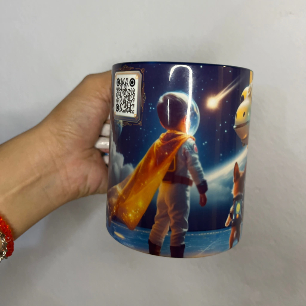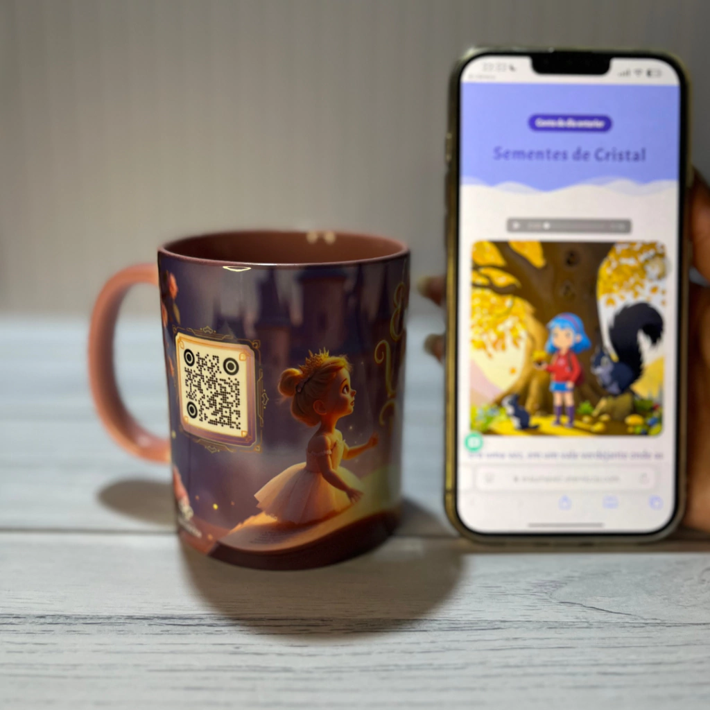 Ao escanear o QR Code da caneca, um conto diferente é desbloqueado diariamente.